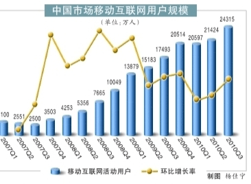 昨天,Enfodesk易观智库最新发布的数据显示,2010年第三季度中国移动互联网用户规模达2.43亿人,环比增长13.15%,同比增长39%,再创历史新高。