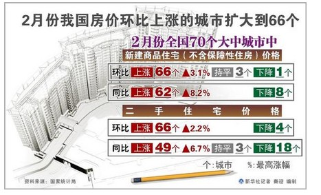 的确,国家统计局同日发布的“2月份70个大中城市新建商品住宅(不含保障性住房)价格变动情况”显示,整体市场在2月出现上涨加速的现象。