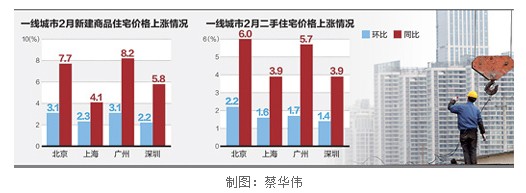 特别值得注意的是,2月份一线城市上涨幅度明显超过全国平均水平。京、沪、广、深四大城市的房价上涨幅度远远超过其他二、三线城市。