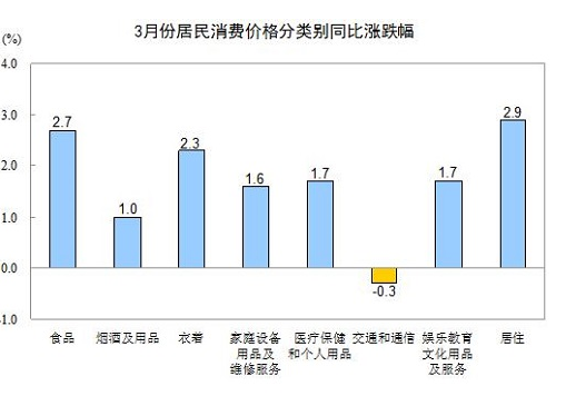 中新网4月9日电 今日,国家统计局发布2013年3月份居民消费价格变动情况,3月份,全国居民消费价格总水平同比上涨2.1%。其中,食品价格上涨2.7%,非食品价格上涨1.8%;居住价格同比上涨2.9%,其中,住房租金价格上涨3.7%。