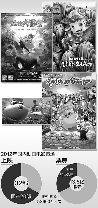 据媒体发布的《2012年国产动画电影发展报告》数据显示,2012年,国内制作完成并获得公映许可的动画电影共计33部,比2011年增加了9部,这已是国产动画影片产量连续3年保持30%以上的增速。全年进入国内城市主流院线和影院上映的动画电影共32部,产出票房13.5亿多元,占国内总票房的8%左右,其中国产动画电影共20部,产出票房4亿元左右。从观影人次分析,32部动画片吸引观众近3600万人次,占全年观影人次总数的8%左右。