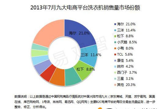 从细分品牌的情况来看,2013年7月九大电商平台洗衣机销量市场份额品牌排名前三甲是:海尔、占比21.0%,三洋、占比11.4%,松下、占比8.8%。在单品销售TOP10中,海尔洗衣机占2席,三洋占2席,吉德、格兰仕、小天鹅、松下、小鸭、TCL各占1席。