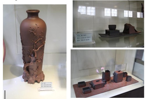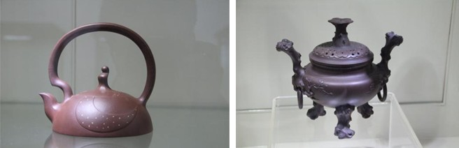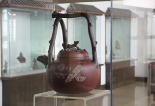 均陶端庄稳重、敦实调和的余味还未散去,迎面又扑来风格高雅、如珠似玉、万种风情含蓄而出的紫砂陶艺术品,此乃金花之四。现今的宜兴人,你可以不知道精陶、美彩陶,甚至均陶,但你绝对不能不知道紫砂陶。紫砂属于无釉陶器,质地细腻、含铁量高、可塑性强,有较好的透气性,但透而不漏,用其制作的紫砂壶泡茶,一直传有“冬天泡茶茶不凉,夏天泡茶茶不馊”的神奇效果。