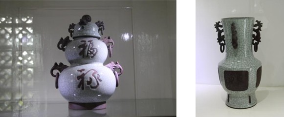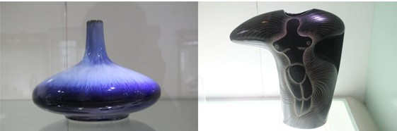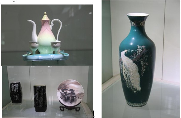 紧接“精陶”之后的便是金花之二“美彩陶”,指美术陶瓷和彩釉细陶,是在传统工艺基础上发展起来的陶瓷艺术新奇葩。釉色有红、蓝、黄、白、黑等20多种单色釉,以及茶末釉、金星釉、毛皮釉、叠翠釉、雨点红等50多种高温变色釉,各种釉料在烧制中流串,融化,聚散,形成灿若锦绣、奇彩斑斓的佳品美作。作品以雕塑、花瓶、灯具、壁画等为主,釉色丰富,装饰绚丽,真有“前无古人,后无来者,舍我其谁?”的韵味风格!站在这样的艺术品面前,除了欣赏、赞叹、可以用相机留下作品的照片外,你还能做什么呢,你还需做什么呢?