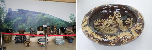 欣赏完色彩绚丽、多姿多彩的“精陶”和“美彩陶”后,金花之三“均陶”一下子给你返璞归真的感官差距,真是另有一番风味在心头。宜兴均釉陶器自宋代以来就以独特的制作工艺,端庄的造型和富有特色的釉色著称于世,始于宋,盛于明,嘉靖、万历年间欧子明的“欧窑”最为著名。均陶色彩丰富,有均红、均蓝、膏白、古铜、黛青等各种彩釉,釉料中含钙、磷,装饰于器皿之上,于端庄古雅中显示出生机。均陶的品种也从原来的缸、盆、钵等发展到花盆、花瓶、园林陶瓷、艺术壁画等形式。均陶,对于宜兴人来说,并不会陌生,宜兴至屺亭国道上的老款路灯,就是盘龙样式的均陶,在经历了十几个风雨春秋,最后因道路改建去年被拆除。而留在我儿时记忆中的宜兴陶瓷就是这些均陶,但时至今日,细细品味,这些佳作仍然“古朴中饱含灵气,大俗中得见大雅”。