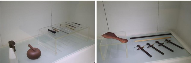 在紫砂历史馆的第一陈列室,让人深深体会那句“工欲善其事必先利其器”的真谛,这局俗语在制壶工艺上有了淋漓尽致的体现。在没有了解紫砂壶制作工艺前,你无法想象从一抔细细的紫砂泥到一把小小的紫砂壶,竟然可以用上多达五十多种制壶工具,而且其中的一些工具都是作者根据自己的喜好、习惯而特制,以求得心应手、游刃有余。在这些工具上,我看到作者要成功制出一把极品紫砂茗壶时,将是如何千锤百炼、精雕细琢,将是如何谨慎缜密、一丝不苟。一把小小的紫砂壶,还隐藏着如此多的玄机,看来真是“壶中有乾坤”哪!
