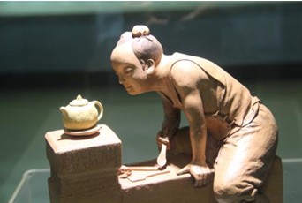 转过身来,一座由徐秀棠大师创作的“供春学艺”紫砂雕塑又把人一下带回到过去的历史之中,被尊为紫砂壶创始者的供春正屏气凝神、全神贯注地创作着其代表作——树瘿壶,此壶真品现被国家博物馆收藏。后人这样称赞他:彼新奇兮万变,师造化兮元功。信陶壶之鼻祖,亦天下之良工。一个的侍童在艺术领域竟能达到如此巅峰地步,真令人叹为观止。