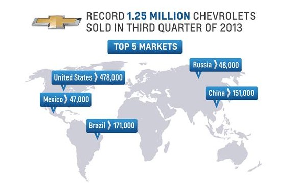 2013年9月,通用汽车及其合资企业在最大单一市场中国的销量达到277,647辆,创下公司在华历年9月销量新高,较之去年9月份的244,266辆销量,同比增长13.7%。前三季度,通用汽车总计在中国市场销售了2,312,418辆汽车,去年同期为2,081,812辆,今年同比增长11.1%。