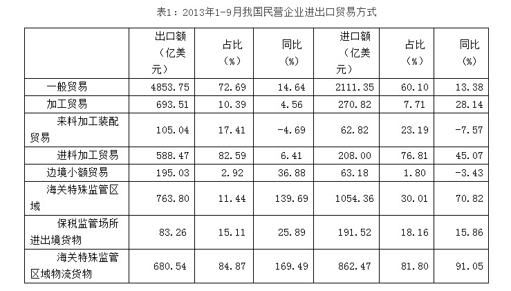我国民营企业大多利用国内成熟的配套产业链,使用国内生产要素加工成产成品,因此主要采用一般贸易方式发展对外贸易,与外资企业大多以加工贸易出口为主相比,有着显著的差别。今年前9个月,民营企业以一般贸易方式出口4853.75亿美元,占同期民营企业出口额的72.69%,增长14.64%;以一般贸易方式进口2111.35亿美元,占同期民营企业进口额的60.10%,增长13.38%。
