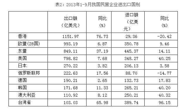 2001年我国民营企业进出口额仅为309.32亿美元, 2012年达1.15万亿美元,12年间增长超过37倍。2013年仅前3季度进出口额超万亿美元。其中,进口3513.23亿美元,增长27.06%;出口6677.23亿美元,增长21.36%。