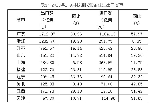 民营经济发达的沿海省市是我国民营企业进出口的主要地区,中西部地区发展提速。2013年前9个月,民营企业出口大省广东省和浙江省分别出口1712.97亿美元和1232.70亿美元,均保持快速增长,同比增长均超过19%。广东省为民营企业第一大进口省,进口1164.10亿美元,增长57.97%。江西省出口171.73亿美元,增长29.18%;进口12.16亿美元,增长34.42%。(下表)