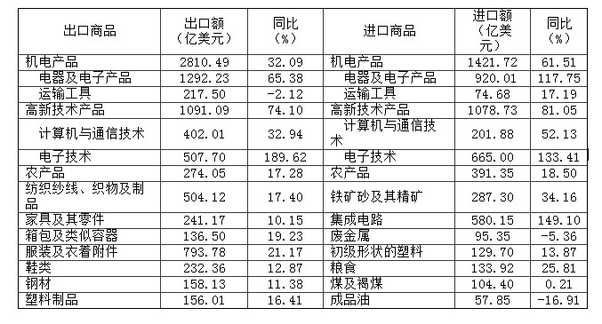 五、机电产品和劳动密集型商品主导出口,进口以机电商品、初级商品和资源性产品为主。