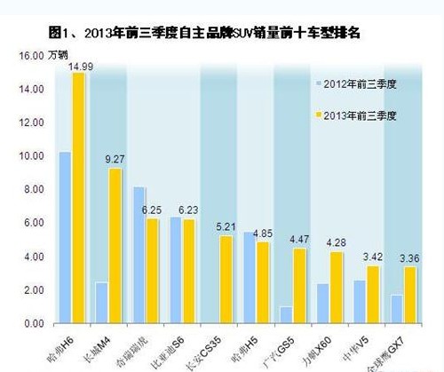 今年前三季度,自主SUV销量前十车型依次是哈弗H6、长城M4、奇瑞瑞虎、比亚迪S6、长安CS35、哈弗H5、广汽GS5、力帆X60、中华V5和全球鹰GX7.。这些车型中,近年内上市的新车较多,有长城M4、长安CS35、广汽GS5、全球鹰GX7,其为自主SUV销量提供的增量较大。其中的长城M4今年前三季度销量累计已达9.27万辆,排名第二位,长安CS35(销量5.21万辆)也进入前五。