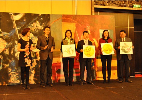 画家王占欣、李红兵向中国国际友好联络会会长助理李薇、北京万豪酒店总裁陈彬、中国国际友好联络会理事部主任高静、中国戏曲学院副院长巴图(从左至右)赠送画作