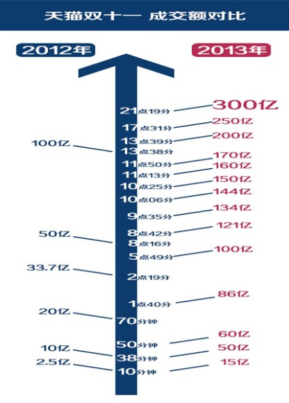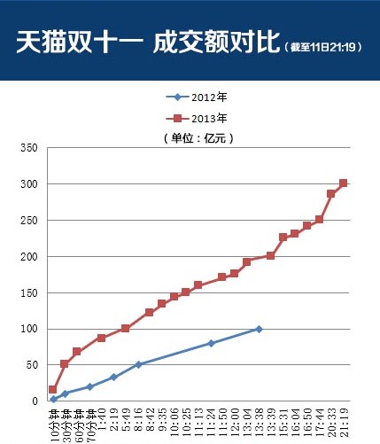 天猫官方数据显示,21点19分,支付宝交易额达到300.22亿。13点04分,双十一支付宝单天交易额达到191亿,已追平去年全天销售记录。