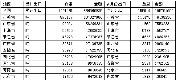 1-9月全国及前十位省区中纤板出口数量和金额