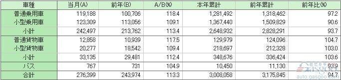 今年11月份,日本汽车销量由去年同期的243,974辆提升至276,399辆,同比上涨了13.3%;其中乘用车销量同比提升13.4%至242,497辆;货车销量(包括普通货车及微型货车)则达到33,135辆,较去年同期增长了12.4%。