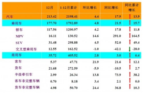 2013年,汽车产销2211.68万辆和2198.41万辆,同比增长14.76%和13.87%。其中乘用车产销1808.52万辆和1792.89万辆,同比增长16.50%和15.71%;商用车产销403.16万辆和405.52万辆,同比增长7.56%和6.40%。