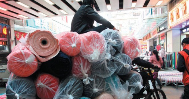 在中大商圈,总有堆满布匹的三轮车、摩托车在拥挤的市场内摇摇晃晃地穿行。这里有60多个纺织专业市场,超过6万家商户以“前店后厂”的传统模式在纺织面料这个传统行业里谋取财富。商圈内几个以经编面料为主的专业市场中,大袋大袋的经编面料摞在一个个铺面门口,来自全国乃至世界各地的服装商在这里看样品、谈价格。