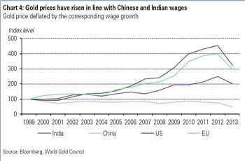 (收入增长调整后的金价:深紫色印度;浅紫色中国;深绿色美国;浅绿色欧洲。)