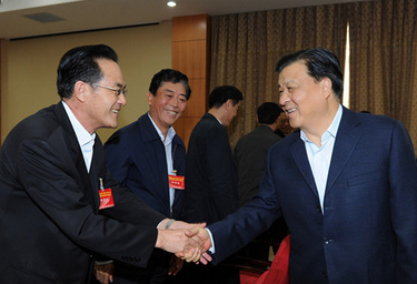 4月16日,中共中央政治局常委、中央书记处书记刘云山在北京主持召开省部级干部学习贯彻习近平总书记系列重要讲话精神研讨班学员代表座谈会并讲话。这是座谈会开始前,刘云山同研讨班学员代表亲切握手。 新华社记者 饶爱民 摄
