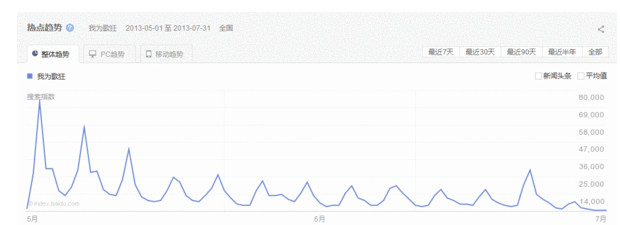 ① 电视圈内综艺节目竞争激烈,恐难有胜算。安徽卫视素以"大剧立台"自居,但在2013年按捺不住,做起了综艺节目。2013年5月,安徽卫视《我为歌狂》首播收视率为1.139(CSM32数据)据说超过了湖南卫视《我是歌手》的1.06,但随后的一个月表现却一路下滑,与《我是歌手》步步攀升的表现形成鲜明对比。(以下二图为两节目在各自播出期间的百度指数,点击可看大图。)