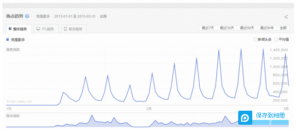 (上图:湖南卫视《我是歌手》第一季播出期间百度指数走势图)