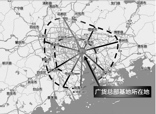 (注:图中虚线为道路规划,环绕广州南沙为中心,建立两层高速道路。)