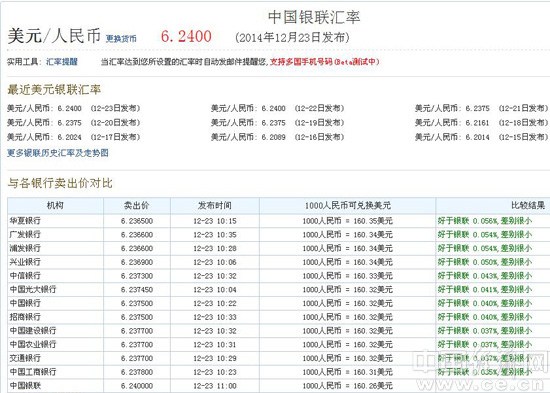 由上图可见,“银行卖出价好于银联”表明通过银行机构兑换外币,比通过银联兑换外币更加实惠。以1000元人民币兑换美元为例,按当日银联汇率计算,可兑换约160.26美元,而若按当日银行卖出价计算,最少可兑换约160.31美元,最高可兑换约160.35美元。此外,中国经济网记者查询发现,英镑、港币等其它37个币种的银行机构卖出价也均好于银联汇率。