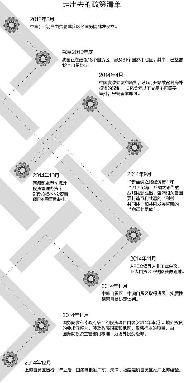 国家战略也在向走出去倾斜,“新常态将给中国带来新的发展机遇。”11月9日,国家主席习近平在亚太经合组织(APEC)工商领导人峰会上表示,在抓住发展机遇的同时,中国也要努力使自身发展更好惠及亚太和世界,未来10年中国对外投资将达1.25万亿美元。