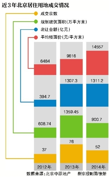 根据北京中原地产统计,2014年北京共出让52宗居住类用地,规划建筑面积合计900.7万平方米,出让金合计1311.2亿元,整体平均楼面价折合14557元/平方米。这一平均楼面价较2013年的9616元/平方米,上涨约51.4%。