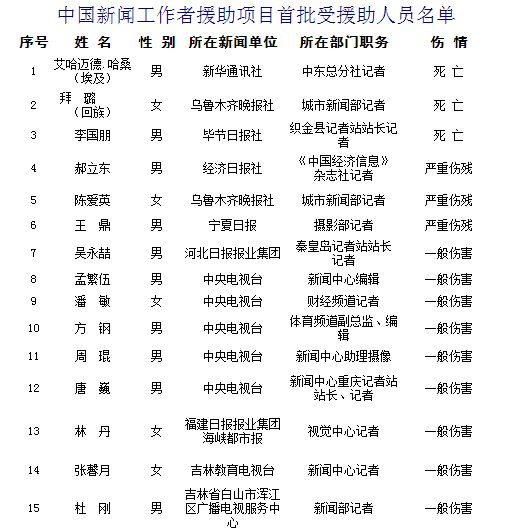 中国记协今年初颁布了《中国新闻工作者援助项目实施办法》。截至到8月底,共收到3家中央主要新闻单位、14个省区市24家新闻单位、1家全国性行业报47人申报材料。经审核,最终15名申请人获得援助金。其中,新华社中东分社记者艾哈迈德·哈桑等3人为因公殉职,分别获得30万元援助金;新疆乌鲁木齐晚报社城市新闻部记者陈爱英等3人为严重伤残,分别获得5万元援助金;中央电视台记者孟繁伍等9人为一般伤害,分别获得5000至1万元援助金。