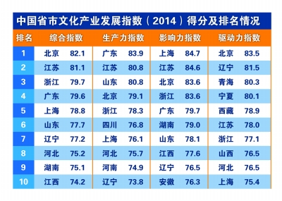 2014年中国省市文化产业发展指数包括综合指数、生产力指数、影响力指数和驱动力指数4个方面。总体来看,与去年相比,我国区域文化产业综合发展格局基本未变,各省综合指数排名有小幅度变动,河北、湖南、江西挤进全国前十名;生产力指数全国排名变化较小,东部地区凭借丰富的文化资源、资本以及人才投入,在前十中占据八个席位;影响力指数排名有一定浮动,前十名的省市中,除了湖南、江西、安徽外,其他均来自东部沿海发达地区。值得注意的是,驱动力指数排名前十位的省市中,有将近一半出自中西部地区,而且,青海、宁夏、西藏三省区进入驱动力指数前五名。