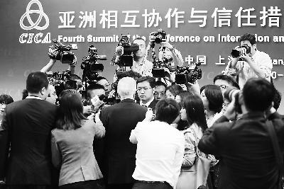 亚信峰会是2014年中国两大主场外交之一。图为中外记者积极报道亚信峰会开幕。