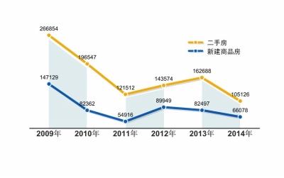 根据中原地产市场研究部统计数据显示,2014年北京二手房住宅网签套数为105126套,从2008年下半年全面网签以来,去年二手房成交量是连续6年来历史最低的一年,相比2013年同比下调幅度达到了35.4%。从单月成交情况看,2014年前10个月连续出现了低于1万套成交量的历史最低;11月受到一系列刺激政策的影响,但成交量也仅在1.1万套左右;12月整体市场成交继续复苏,全月网签二手房达到14671套,比11月上涨了29.6%。