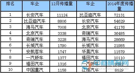 2014年12月,长安汽车、比亚迪汽车和海马汽车位居自主品牌企业微博平台品牌传播榜前三位,传播量均大幅提升。其中,长安汽车和海马汽车利用圣诞节策划微博话题,获得较多的转发和评论。长安汽车将线上和线下活动相结合,12月24~28日在成都金牛万达广场举办线下活动,官方微博配合此活动策划了“圣诞老人去哪了”线上话题,转发量最多的粉丝将获得iPhone6一台。海马汽车“圣诞佳节送寄语”话题也得到粉丝的热情支持。粉丝将对海马汽车的寄语按照规定句式说出来,将有机会获得100元话费。值得一提的是,网友参与海马汽车的话题活动,需要先成为其官微的粉丝,这样不仅提高了传播量,还增加了官微的粉丝量。另外,比亚迪是由于其股价暴跌事件,吸引投资爱好者和金融人士在微博上进行讨论和评价。