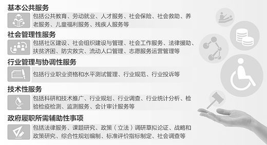 管理办法规定,各级财政部门负责制定本级政府的政府购买服务指导性目录,并根据经济社会发展变化、政府职能转变及公众需求等情况及时进行动态调整。纳入指导性目录的服务事项,应当实施购买服务。应当纳入政府购买服务指导性目录的包括:基本公共服务、社会管理性服务、行业管理与协调性服务、技术性服务和政府履职所需辅助性事项(见图表)。