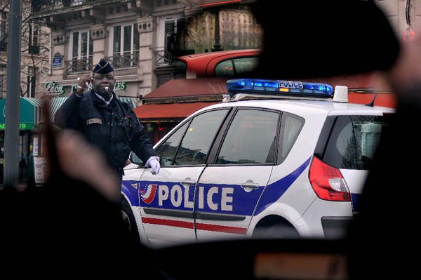 1月7日,在法国巴黎,警察在主要街道检查过往车辆。位于法国巴黎的《沙尔利周刊》总部7日遭到武装分子袭击,目前已造成12人死亡,另有多人受伤。法国总统奥朗德强烈谴责此次袭击。他在袭击现场说:“这无疑是一起恐怖袭击。” 新华社 记者陈晓伟 摄