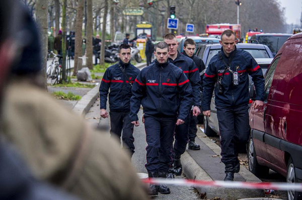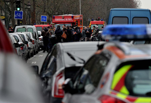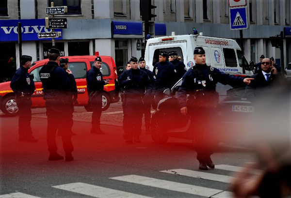 1月7日,在法国巴黎,警察在袭击现场附近警戒。位于法国巴黎的《沙尔利周刊》总部7日遭到武装分子袭击,目前已造成12人死亡,另有多人受伤。法国总统奥朗德强烈谴责此次袭击。他在袭击现场说:“这无疑是一起恐怖袭击。” 新华社 记者陈晓伟 摄