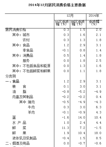 2014年12月份,全国居民消费价格总水平同比上涨1.5%。其中,城市上涨1.6%,农村上涨1.3%;食品价格上涨2.9%,非食品价格上涨0.8%;消费品价格上涨1.4%,服务价格上涨1.8%。2014年,全国居民消费价格总水平比上年上涨2.0%。