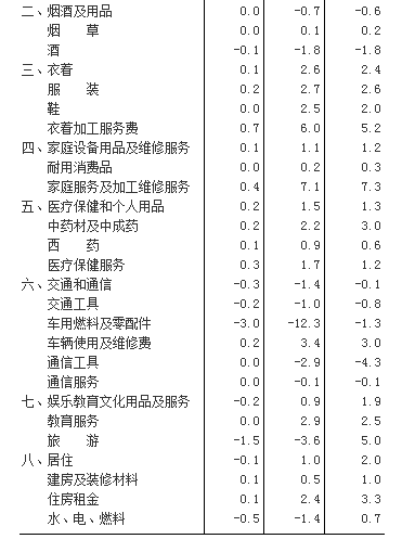 烟酒及用品价格同比下降0.7%。其中,酒类价格下降1.8%,烟草价格上涨0.1%。