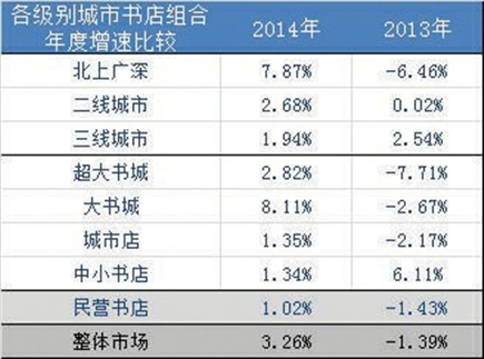 北京开卷信息技术公司发布的《2014年中国图书零售市场报告》批露,2014年,实体书店图书零售市场一改前两年负增长的态势,止跌回稳,增幅达到3.26%。更难得的是,无论在一线、二线还是三线城市,在大书城、中小书店还是民营书店,都实现了正增长,体现了实体书店一次显著的整体回暖。
