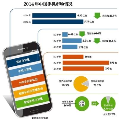 中国工业和信息化部旗下中国信息通信研究院12日发布的数据显示,2014年全年,中国手机市场累计出货量为4.52亿部,比2013年的5.79亿部下降21.9%。