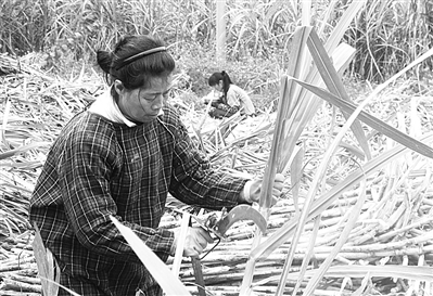 在广西扶绥县,蔗农在田里收割甘蔗,人工收割耗时费力。本报记者 童 政摄