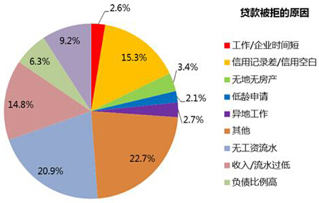 申请贷款为何被拒?这当然是大家最关心的话题。大数据显示,这其中的理由简直五花八门,但无工资流水的用户最悲催,占到了各种被拒理由的20.9%,因为流水、收入过低而被拒的用户占14.8%,因此与收入相关的被拒原因合计占到了35.7%,可见银行放贷款与否,申请人的收入是个至关重要的因素。