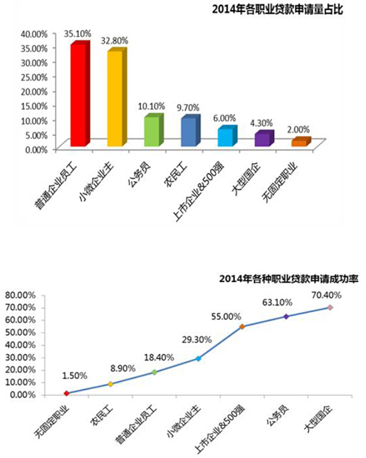 并不是只有穷人才需要贷款,2014年除了普通企业员工和小微企业主这两大主力外,公务员、农民工、上市企业和500强公司员工、大型国企员工,以及无固定职业者都需要通过贷款来解决缺钱问题。在贷款成功率排名上,大型国企员工以70.40%位居榜首,公务员以63.10%紧随其后,充分显示出“铁饭碗”的优越性;而排在最后的无固定职业者的成功率仅有可怜的1.50%,几乎是逢申请必被拒,农民工8.90%的成功率同样让人心塞啊。