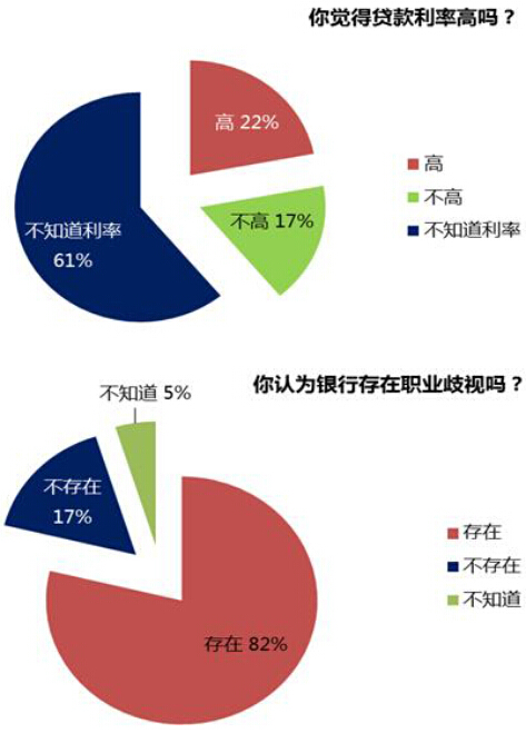 大数据发现,其实很多人是糊里糊涂地去申请贷款的:61%的用户不知道现在的贷款基准利率是多少;仅有11%的用户知道利率市场化;更糟糕的是,贷款前,49%的用户对自己的信用记录没有了解,而超过八成的用户认为银行贷款有职业歧视现象。
