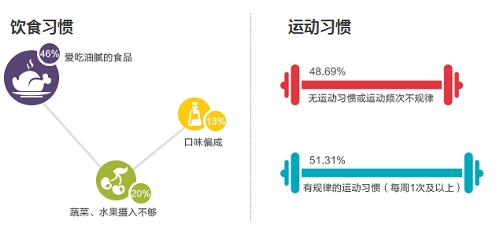 根据《国民健康风险意识调查报告》数据显示:45.83%的高比例人群爱吃油腻的食品,超过一半的国民没有规律的运动习惯(每周一次及以上),以及72.16%的国民不能保证按时睡觉。其中25-29岁人群不健康的生活方式尤为突出,不健康的生活方式直接导致了心脑血管疾病的年轻化。