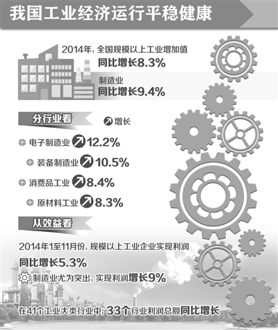 2014年,我国规模以上工业增加值同比增8.3%。虽然增速同比有所回落,但在庞大的基数之上,这一增速尤为不易。更为可喜的是,去年,我国工业经济朝着形态更高级、分工更复杂、结构更合理的方向加速演进——