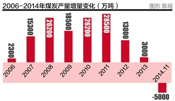 中国煤炭工业协会副会长姜智敏介绍,2014年前11个月全国煤炭产量35.2亿吨,同比下降2.1%,预计全年产量同比减少2.5%左右。这是我国煤炭产量自2000年以来的首次下降。